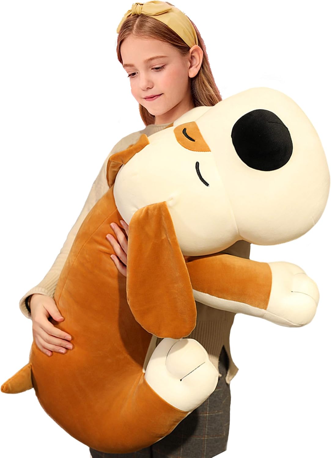 - DOG BODY PILLOW: Huge size 29.5inch, well done, this huggable, squeezable stuffed dog features big ears, cute nose and velvety shell, surely a soft and cozy oversized plush pal.